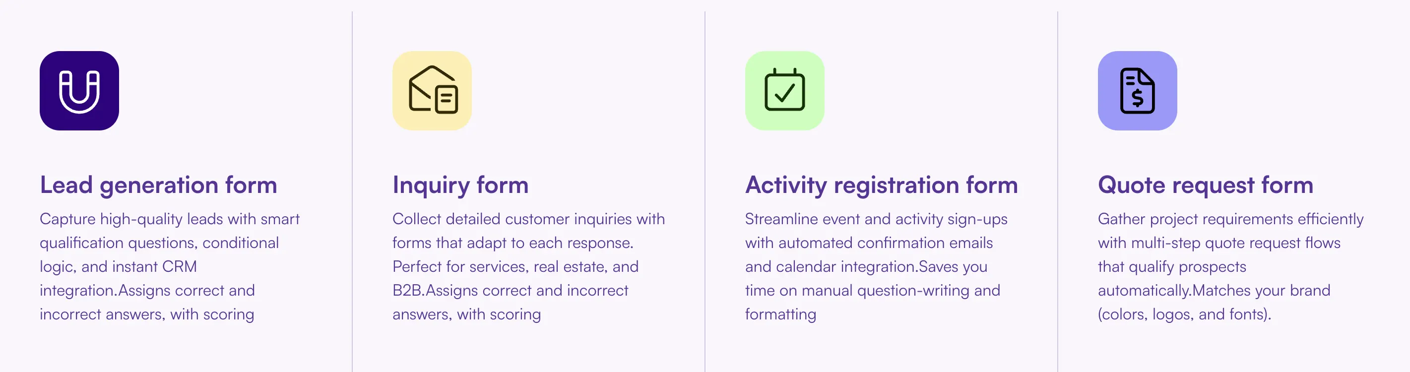 Weavely is an AI-powered form builder that generates and styles your entire form in seconds. You can simply describe your needs in a text prompt, or upload a document to get started. For users looking to collect prospect data and qualify leads, Weavely offers a dedicated lead generation builder, along with multiple generators tailored per a specific lead gen use case.