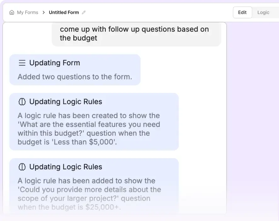 Use conditional logic, multi-page flows, and answer piping to guide users through personalized form journeys.