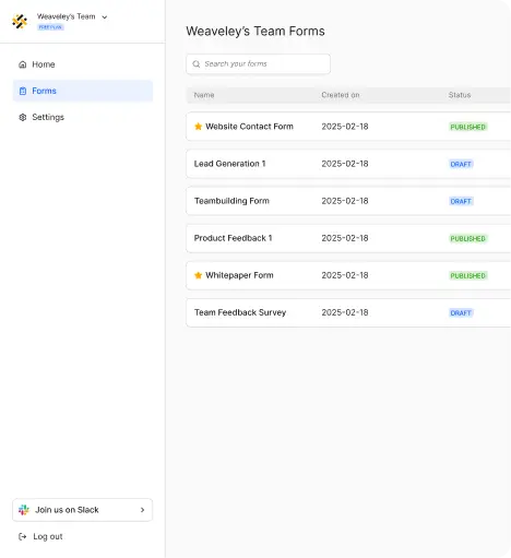 Tell Weavely what you need in your language and get a complete, ready-to-use form in seconds. No templates to hunt through, no fields to drag around.
